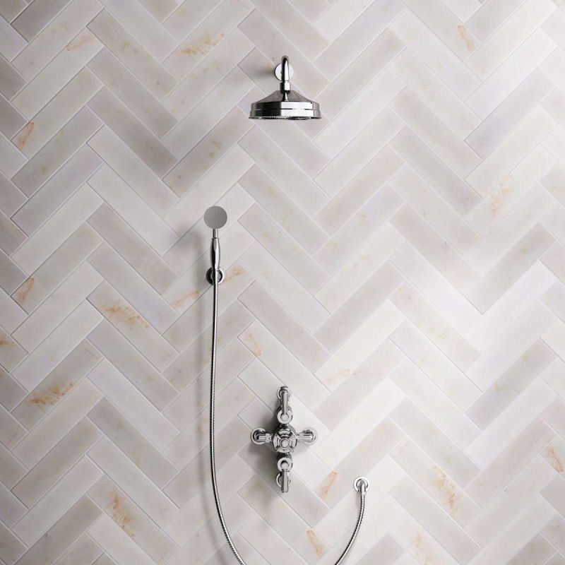 The Ashbee and Stone Chrome Finish Semi-Exposed Dual Outlet Shower Valve with Shower Arm and Diverter Handshower mounted onto a Hook. Shower is supplied with Metal Levers and an 8 inch apron rose.