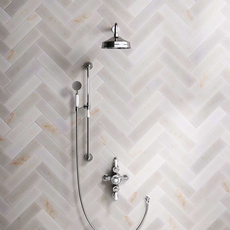 The Ashbee and Stone Chrome Finish Semi-Exposed Dual Outlet Shower Valve with Shower Arm and Diverter Handshower mounted onto Slider-Rail. Shower is supplied with White Ceramic Levers and an 8 inch apron rose.