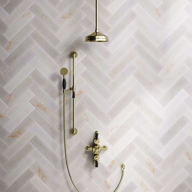 Inspired by Edwardian period showerware, Ashbee and Stone offer this beautifully finished semi-exposed dual outlet shower set in Timeless Brass.