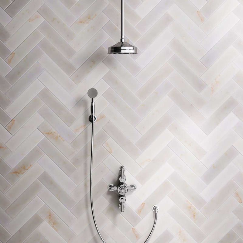 The Ashbee and Stone Chrome Finish Semi-Exposed Dual Outlet Shower Valve with Shower Arm and Diverter Handshower mounted onto a Hook. Shower is supplied with Metal Levers and an 8 inch apron rose.