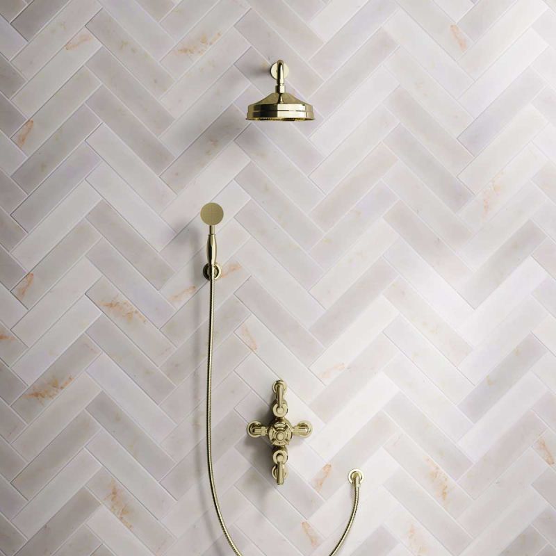 Inspired by Edwardian period showerware, Ashbee and Stone offer this beautifully finished semi-exposed dual outlet shower set in Timeless Brass.