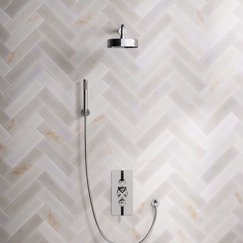 The dual outlet valve provides a handshower feed with options for black ceramic, white ceramic and solid engineered brass lever options, and in chrome, brushed nickel, brushed brass finishes, polished brass and matt black.