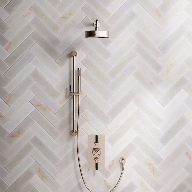 The dual outlet valve provides a handshower feed with options for black ceramic, white ceramic and solid engineered brass lever options, and in chrome, brushed nickel, brushed brass finishes, polished brass and matt black.