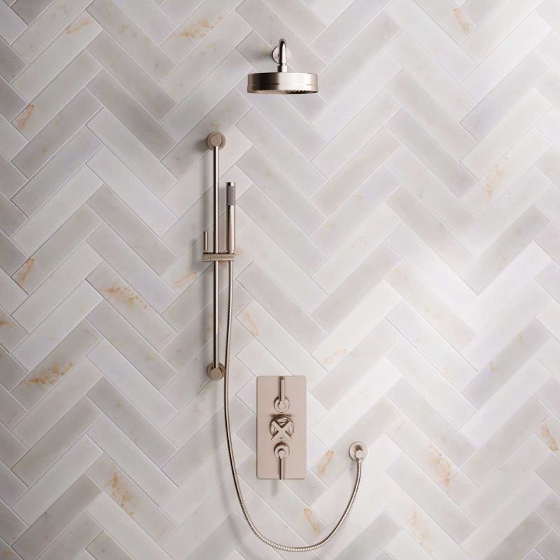 The dual outlet valve provides a handshower feed with options for black ceramic, white ceramic and solid engineered brass lever options, and in chrome, brushed nickel, brushed brass finishes, polished brass and matt black.