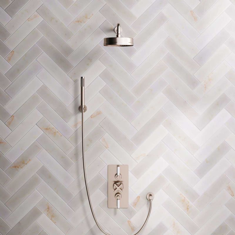 Elbe Dual Outlet Shower Kit - Concealed Valve - 500mm Shower Arm - White Ceramic Lever - Handshower Hook - Brushed Nickel