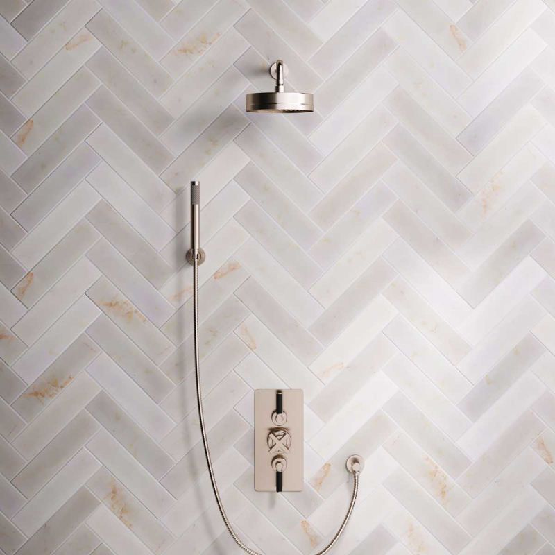 The dual outlet valve provides a handshower feed with options for black ceramic, white ceramic and solid engineered brass lever options, and in chrome, brushed nickel, brushed brass finishes, polished brass and matt black.