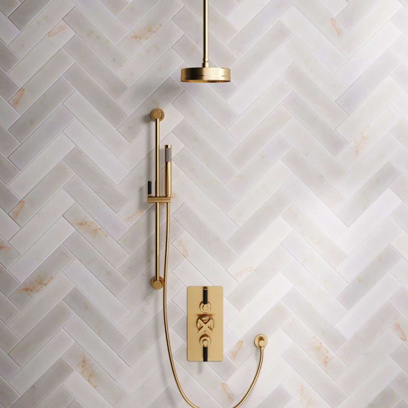 Elbe Dual Outlet Shower Kit - Concealed Valve - Black Ceramic Lever - Handshower Slider-Rail - Ceiling Mounted Rose - Brushed Brass
