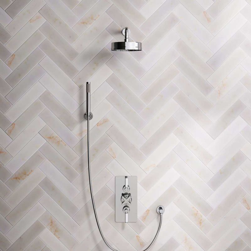 Elbe Dual Outlet Shower Kit - Concealed Valve - White Ceramic Lever - Handshower Hook - Chrome Finish