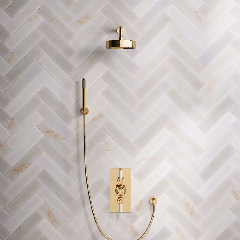 Elbe Dual Outlet Shower Kit - Concealed Valve - White Ceramic Lever - Handshower Hook - Polished Brass