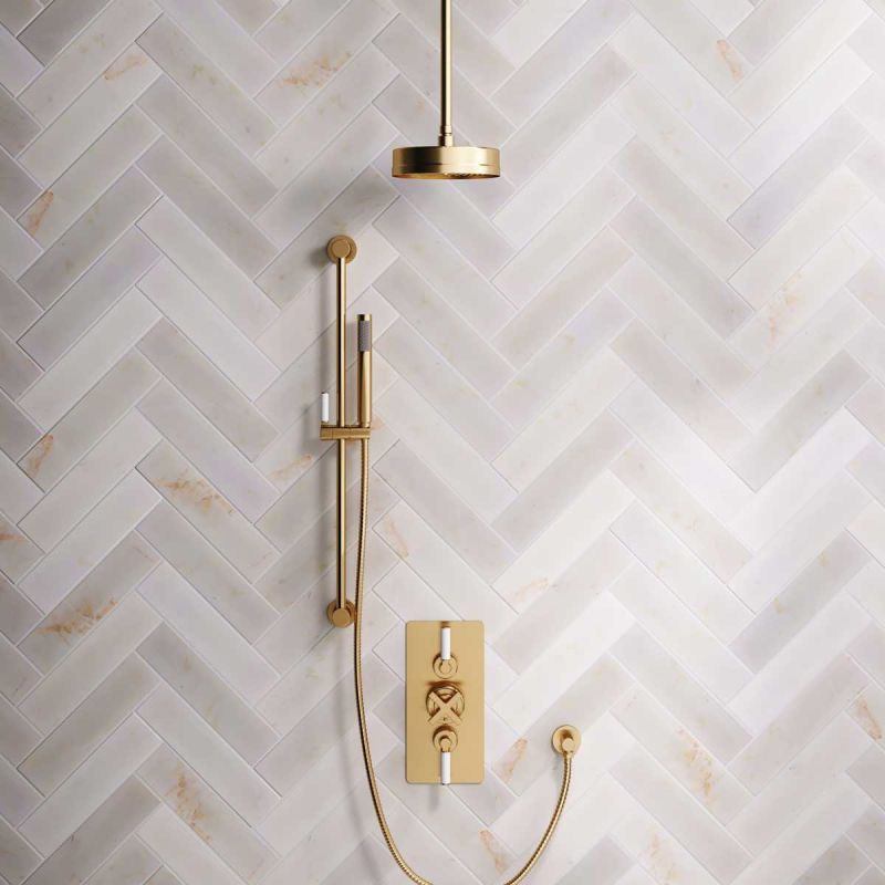 Elbe Dual Outlet Shower Kit - Concealed Valve - White Ceramic Lever - Handshower Slider-Rail - Ceiling Mounted Rose - Brushed Brass