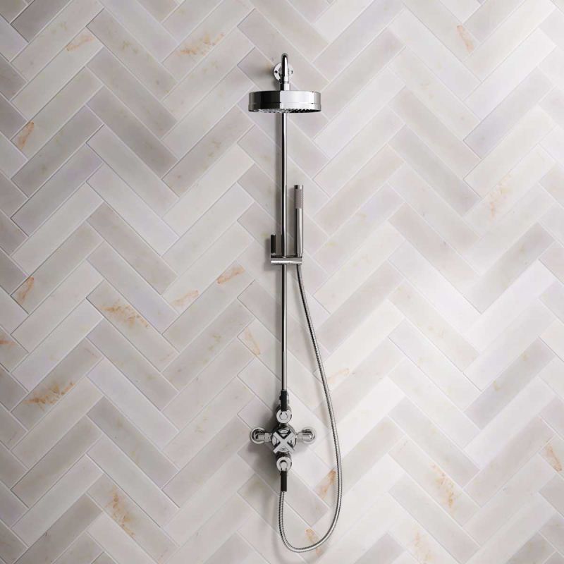 Elbe Dual Outlet Exposed Shower Valve with Handset on Rigid Riser and 8 Inch Rose - Black Lever - Chrome Finish
