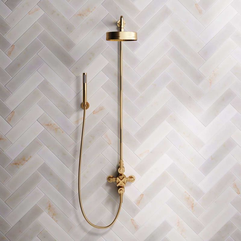 Elbe Dual Outlet Exposed Shower Valve with Rigid Riser, Handset on Hook and 8 Inch Rose - Metal Lever - Brushed Brass