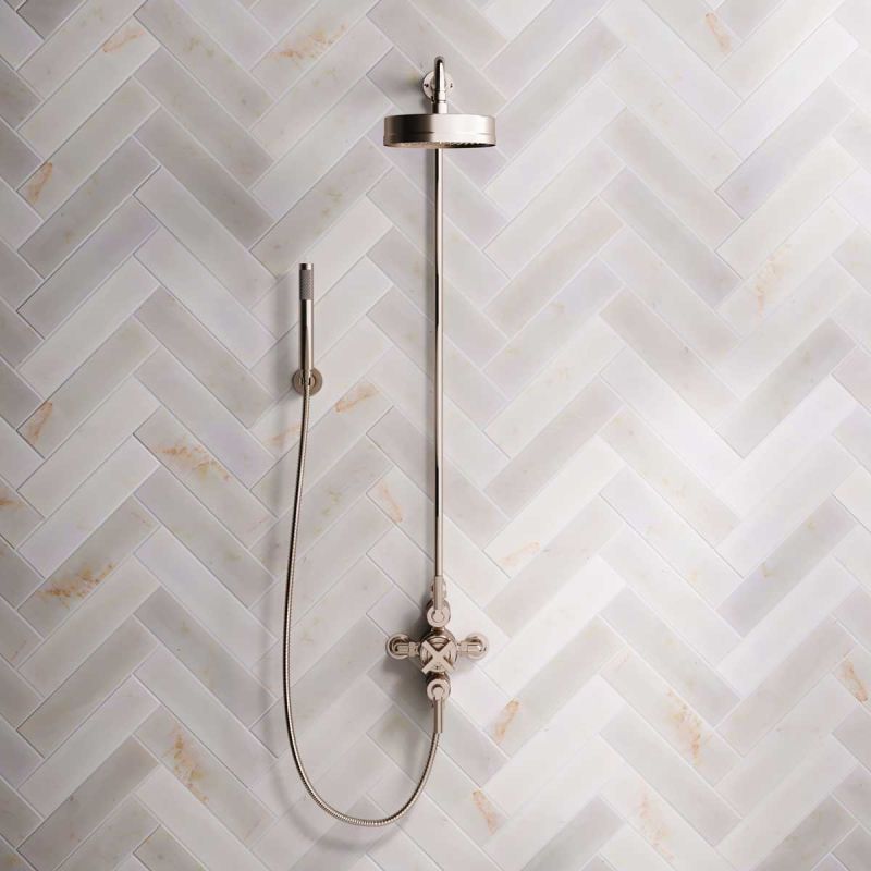 The dual outlet valve provides a handshower feed with options for black ceramic, white ceramic and solid engineered brass lever options, and in chrome, brushed nickel, brushed brass finishes, polished brass and matt black.