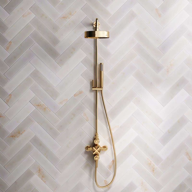 Elbe Dual Outlet Exposed Shower Valve with Handset on Rigid Riser and 8 Inch Rose - Metal Lever - Polished Brass