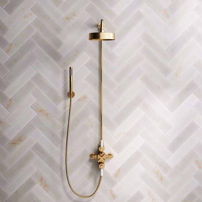 Elbe Dual Outlet Exposed Shower Valve with Rigid Riser, Handset on Hook and 8 Inch Rose - White Lever - Brushed Brass