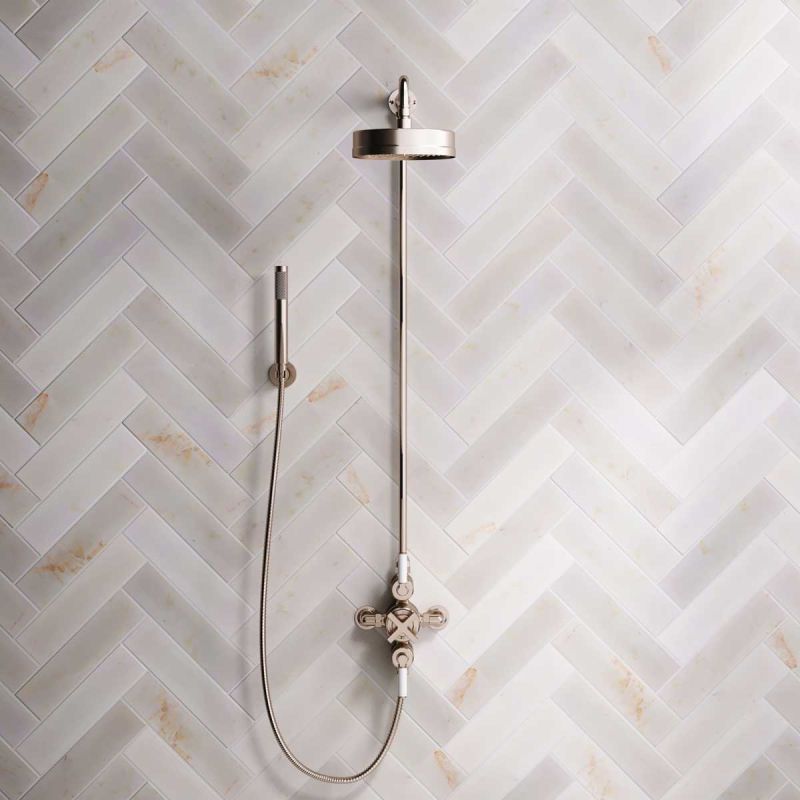Elbe Dual Outlet Exposed Shower Valve with Rigid Riser, Handset on Hook and 8 Inch Rose - White Lever - Brushed Nickel