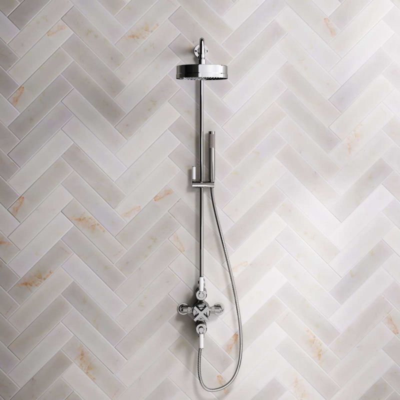 Elbe Dual Outlet Exposed Shower Valve with Handset on Rigid Riser and 8 Inch Rose - White Lever - Chrome Finish