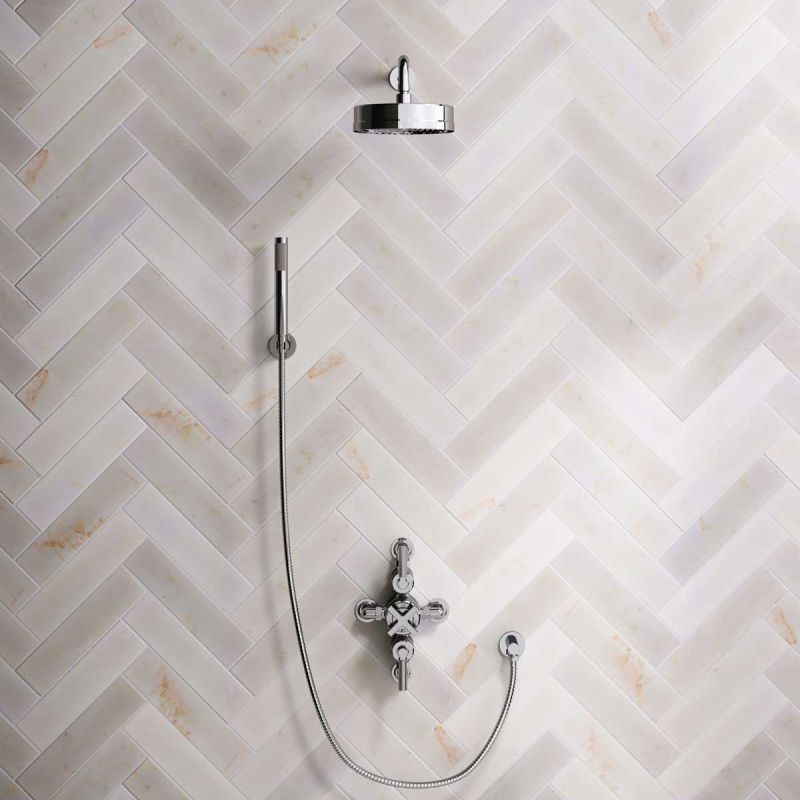 The dual outlet valve provides a handshower feed with options for black ceramic, white ceramic and solid engineered brass lever options, and in chrome, brushed nickel, brushed brass finishes, polished brass and matt black.