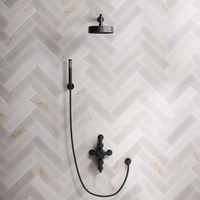 The dual outlet valve provides a handshower feed with options for black ceramic, white ceramic and solid engineered brass lever options, and in chrome, brushed nickel, brushed brass finishes, polished brass and matt black.