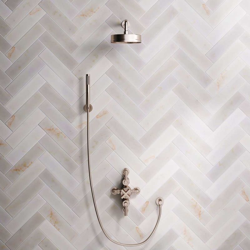 The dual outlet valve provides a handshower feed with options for black ceramic, white ceramic and solid engineered brass lever options, and in chrome, brushed nickel, brushed brass finishes, polished brass and matt black.