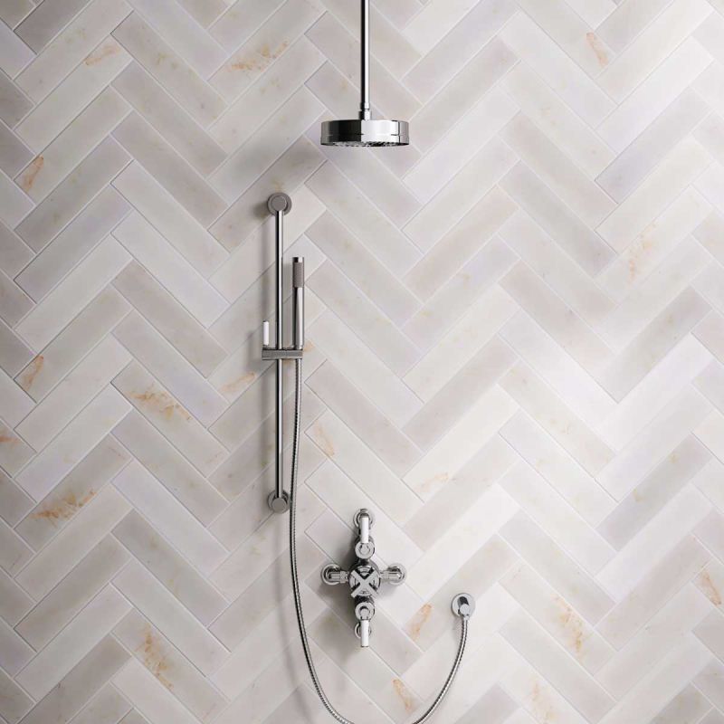 The dual outlet valve provides a handshower feed with options for black ceramic, white ceramic and solid engineered brass lever options, and in chrome, brushed nickel, brushed brass finishes, polished brass and matt black.
