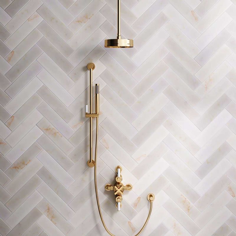 Elbe Dual Outlet Shower Kit - Semi-Exposed Valve - White Ceramic Lever - Handshower Slider-Rail - Ceiling Mounted Rose - Polished Brass