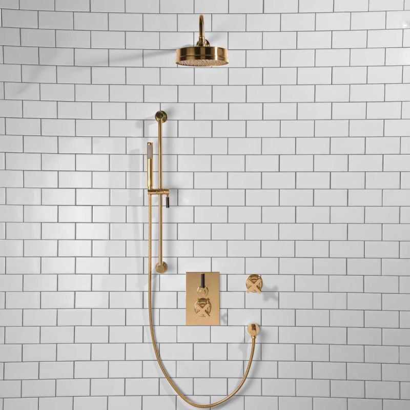 Elbe - Concealed Shower Set + Diverter - 500mm Shower Arm - Black Lever/X-Top - 8 inch Rose - Polished Brass (Min 2 Bar Pressure)