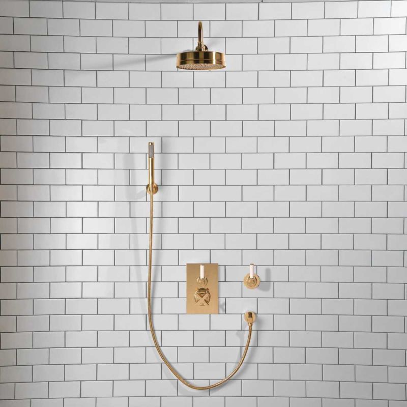 Elbe - Concealed Shower Set + Diverter - Hook Mount - 500mm Shower Arm - White Lever/White Lever - 8 inch Rose - Polished Brass (Min 2 Bar Pressure)
