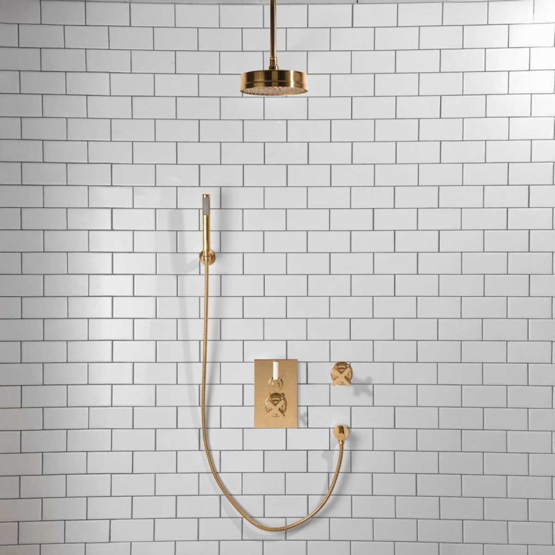Elbe - Concealed Shower Set + Diverter - Hook Mount - White Lever/X-Top - 8 inch Rose - Ceiling Mounted Rose - Polished Brass (Min 2 Bar Pressure)