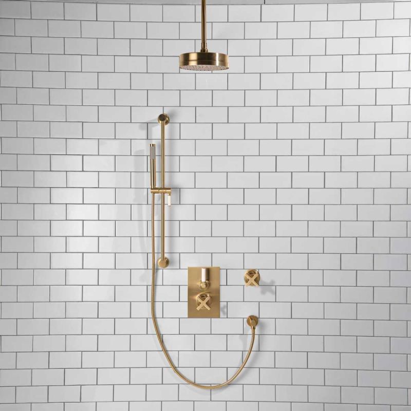 Elbe - Concealed Shower Set + Diverter - White Lever/X-Top - 8 inch Rose - Ceiling Mounted Rose - Brushed Brass (Min 2 Bar Pressure)