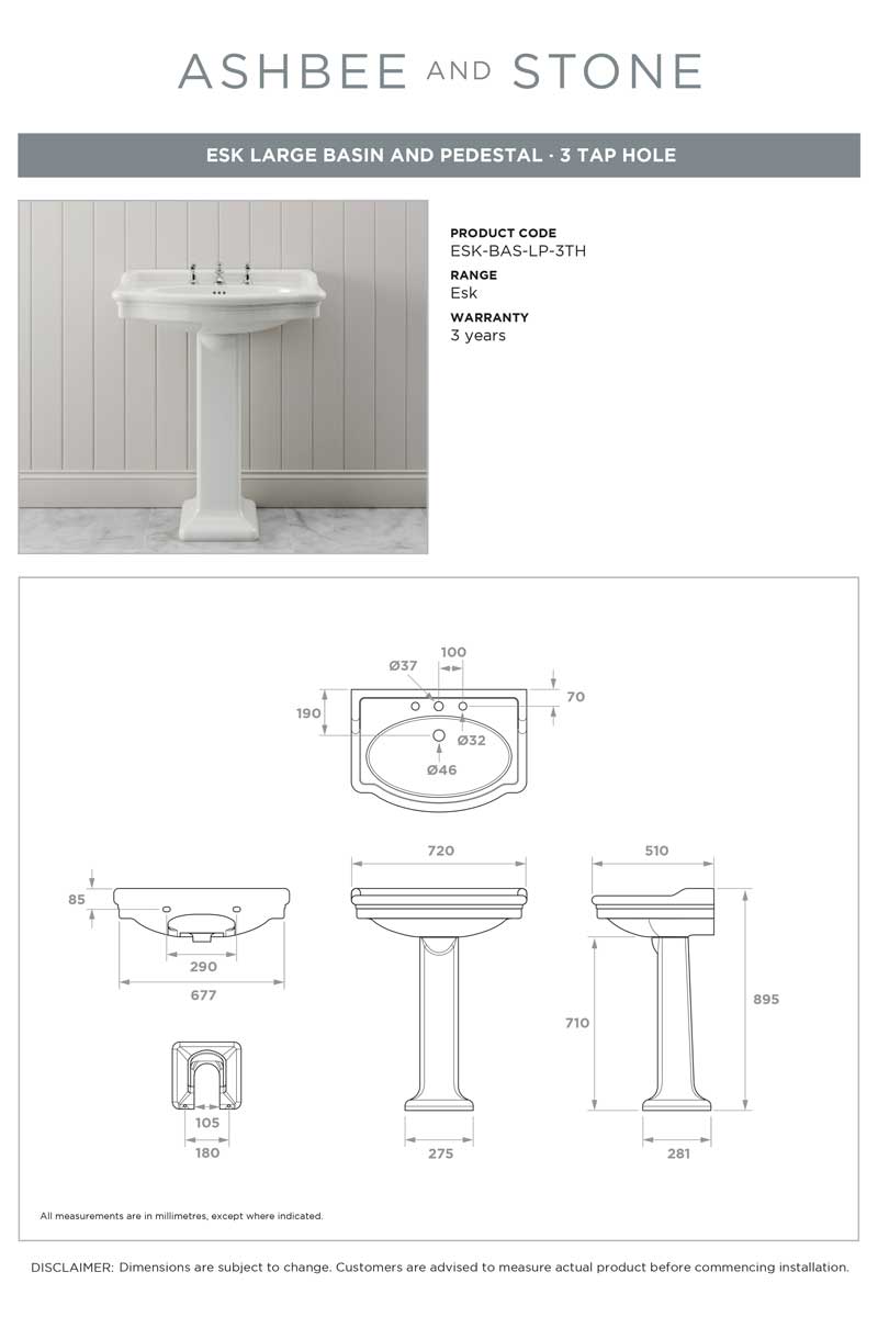 Offered with a choice of 1, 2 or 3 tap holes, the Esk large basin accommodates a variety of brassware styles — from antique-look pillar taps to sleek, modern mixers. Its prominent contours, stepped rim detailing, and full pedestal give it an imposing yet graceful presence that works beautifully in period homes, boutique-style bathrooms, or renovation projects seeking authenticity.