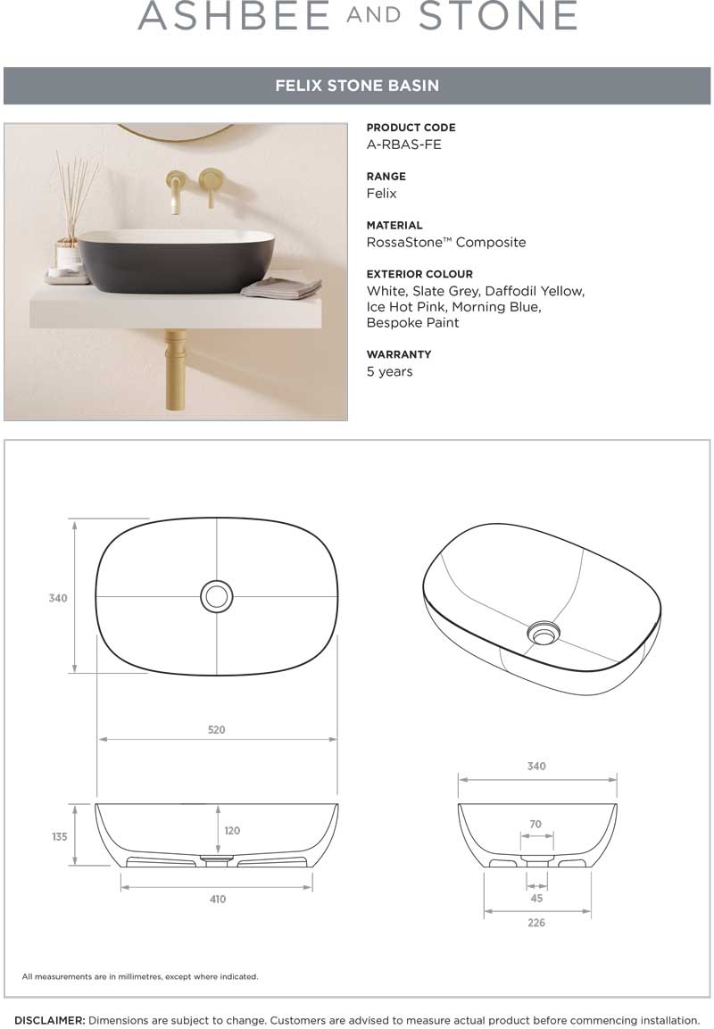 Elevate your bathroom design with the bold sophistication of the Felix Stone Countertop Basin - White crafted from our unique RossaStone® composite. Designed by Ashbee and Stone, this eye-catching coloured basin delivers a perfect blend of style, quality, and functionality for contemporary and modern interiors.