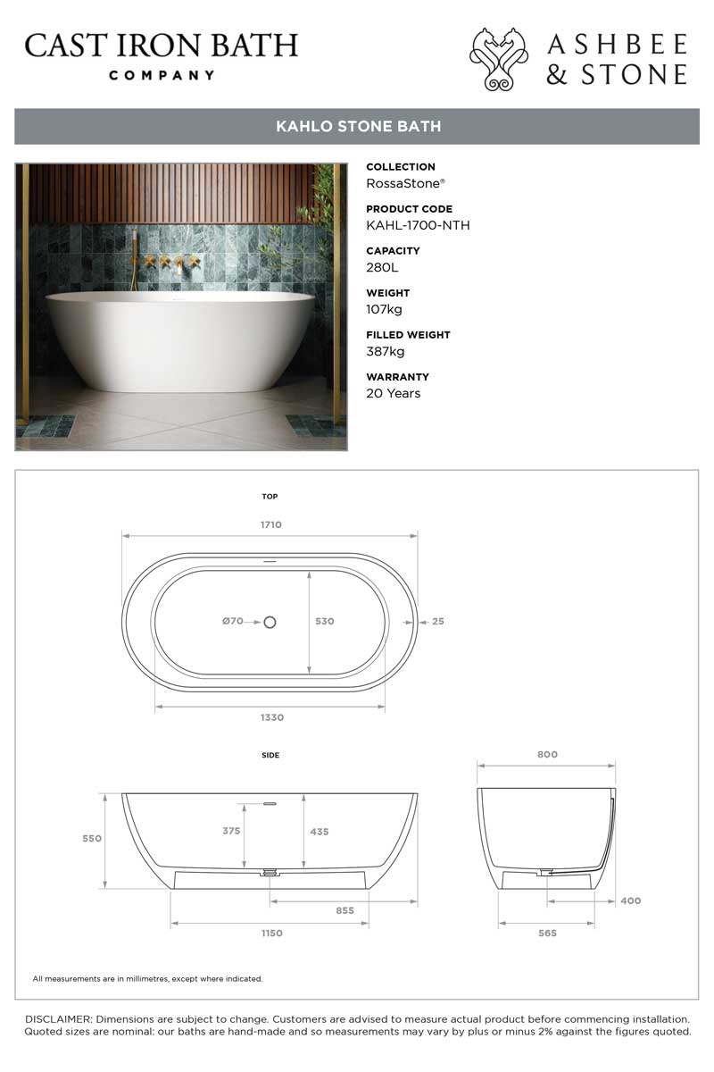 The Kahlo Oval Bath, made from RossaStone® composite, is antibacterial, UV-resistant, and easy to clean. Available in 1500mm (91kg) and 1700mm (102kg) sizes with an integrated waste.