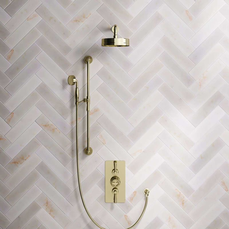 Klee Dual Outlet Concealed Shower with Slider Rail, 300mm Wall Arm & 8" Rose - Metal Lever - Timeless Brass