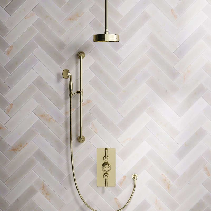 Klee Dual Outlet Concealed Shower with Slider Rail, 210mm Ceiling Arm & 8" Rose - Metal Lever - Timeless Brass