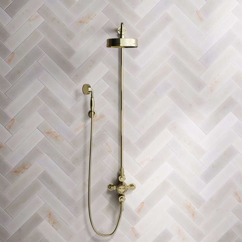 Klee Dual Outlet Exposed Shower with Rigid Riser, Hook Mount & 8" Rose - Metal Lever - Timeless Brass
