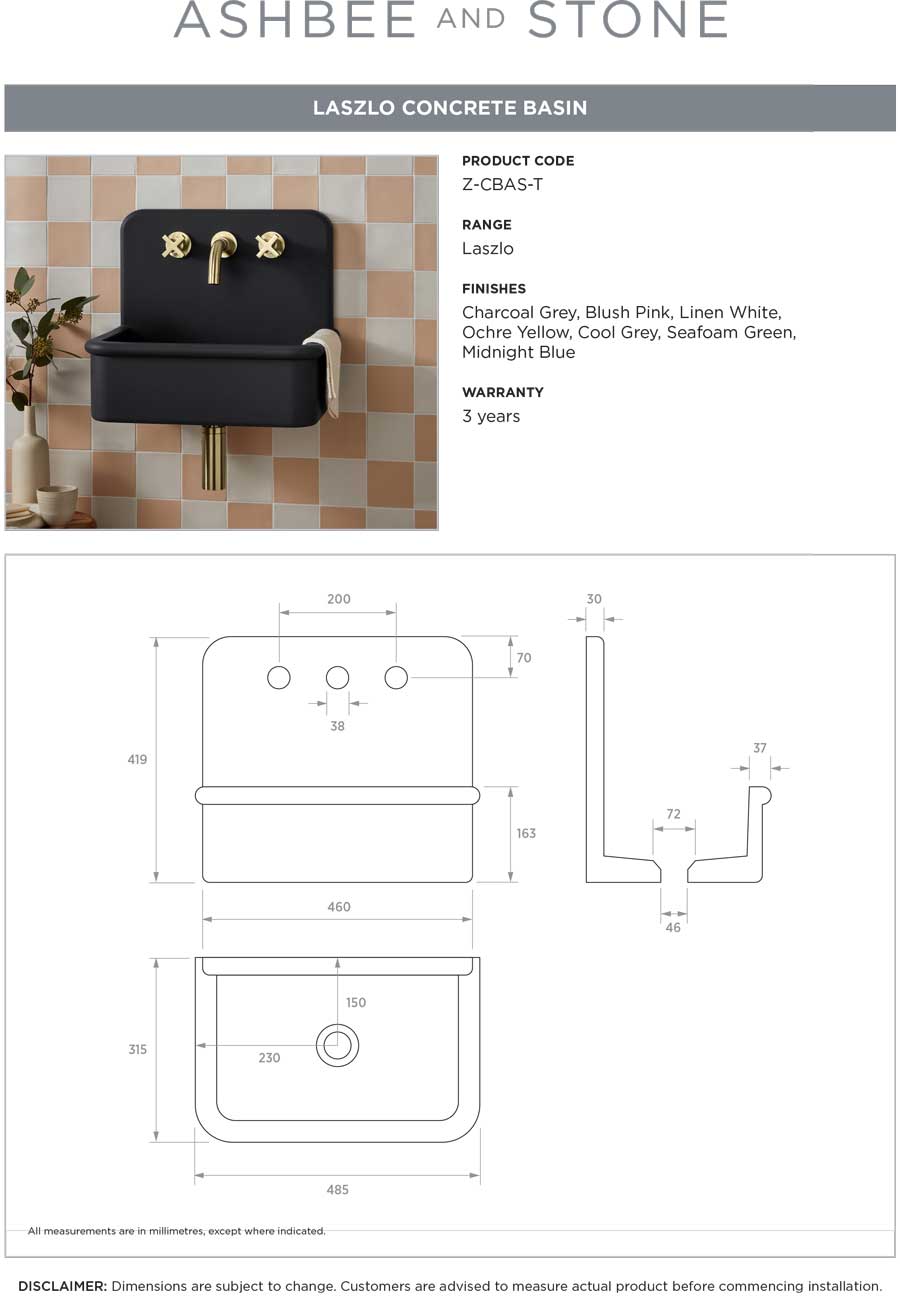 Designed with three tap holes, it seamlessly accommodates our Bayor and Senska backsplash mounting taps. Available in a diverse palette of coloured concrete pigments, this bathroom basin offers versatility to match any interior design. Embodying the robust characteristics of natural stone, each concrete sink is hand-poured and finished, ensuring a unique and striking statement for bathrooms, washrooms, and ensuites.