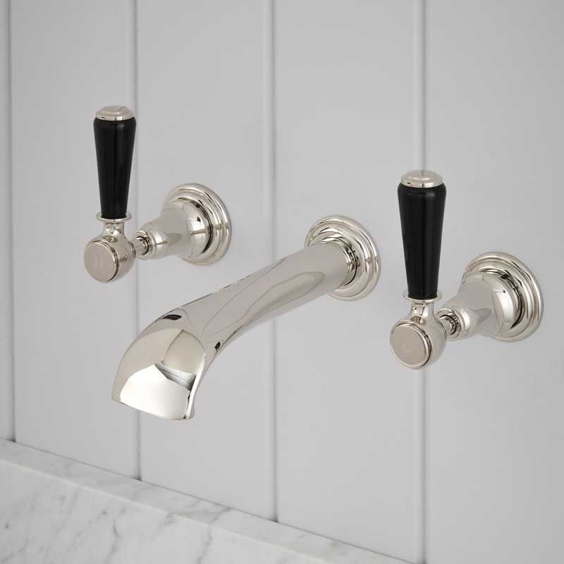 Linton Wall Mounted 3 Hole Basin Mixer - 175mm Spout - Black Lever - Nickel