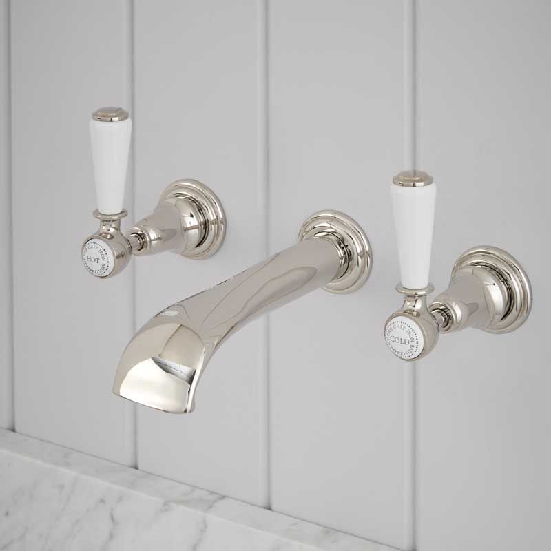 3-Hole Basin Mixer - Wall Mounted - White Lever. Available in a choice of Chrome, Polished Nickel and Polished Brass finish