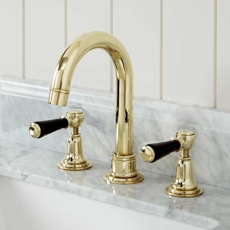 Linton 3 Hole Basin Mixer - Swan Neck Spout - Black Lever - Gold Finish