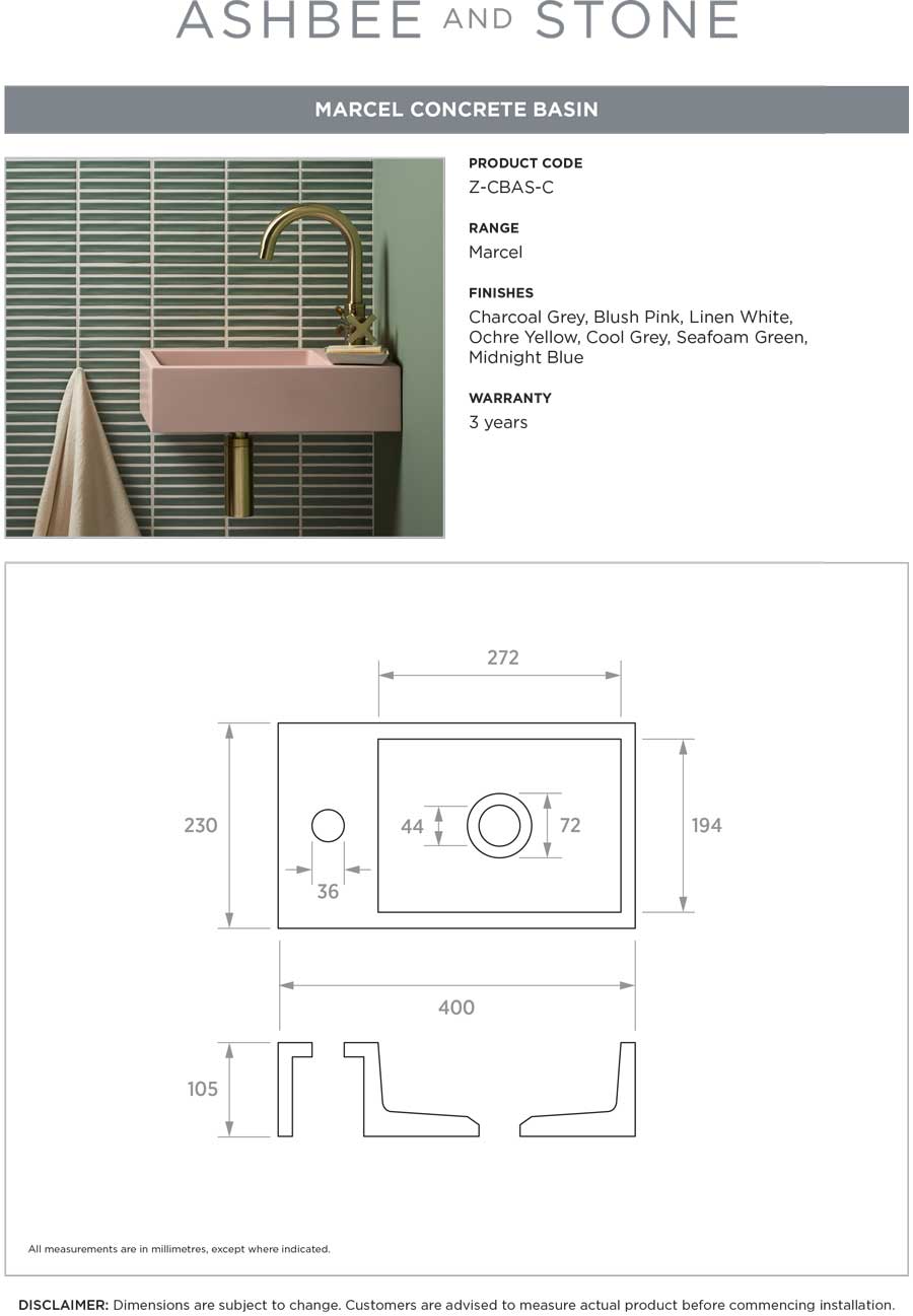INSTALLATION TIP: If you are mounting the concrete basin on our brackets and you would like to achieve an 'invisible mounting' then the brackets need to be chased into the wall or mounted prior to any tiling work - please call us for more details.