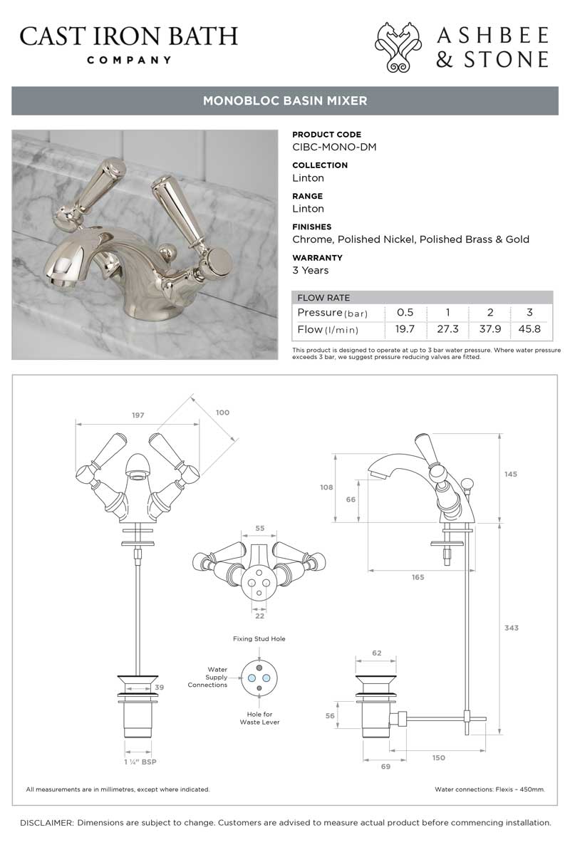 Designed for Ashbee and Stone our basin mixer taps are available in a choice of Chrome, Polished Nickel and Polished Brass finish. These taps have classic lines which compliment our range of basins. All taps come with standard fittings to fit most basins.