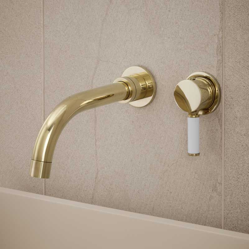 Bayor Wall Mounted 2 Hole Basin Mixer - 200mm Spout - White Lever - Living Brass