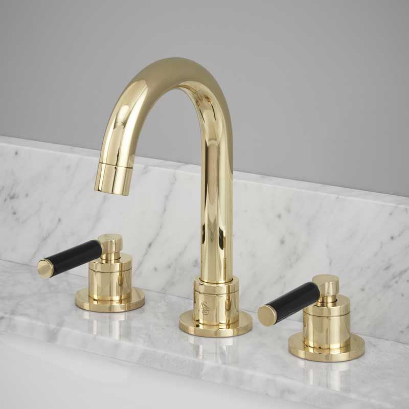 Senska - 3-Hole Basin Mixer - Deck Mounted - Black Lever - Polished Brass