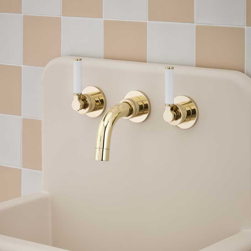 Bayor Backsplash Basin Mounted 3 Hole Basin - White Lever - Living Brass