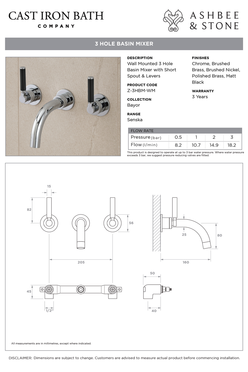 Senska - 3-Hole Basin Mixer - Wall Mounted - Black Lever