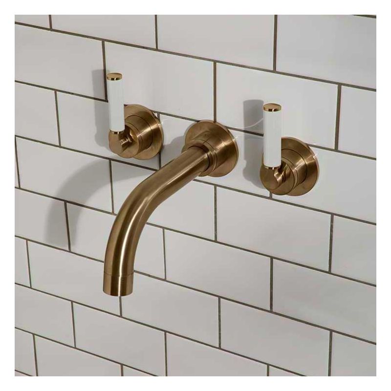 Bayor Wall Mounted 3 Hole Bath Filler - 220mm Spout - White Lever - Brushed Brass