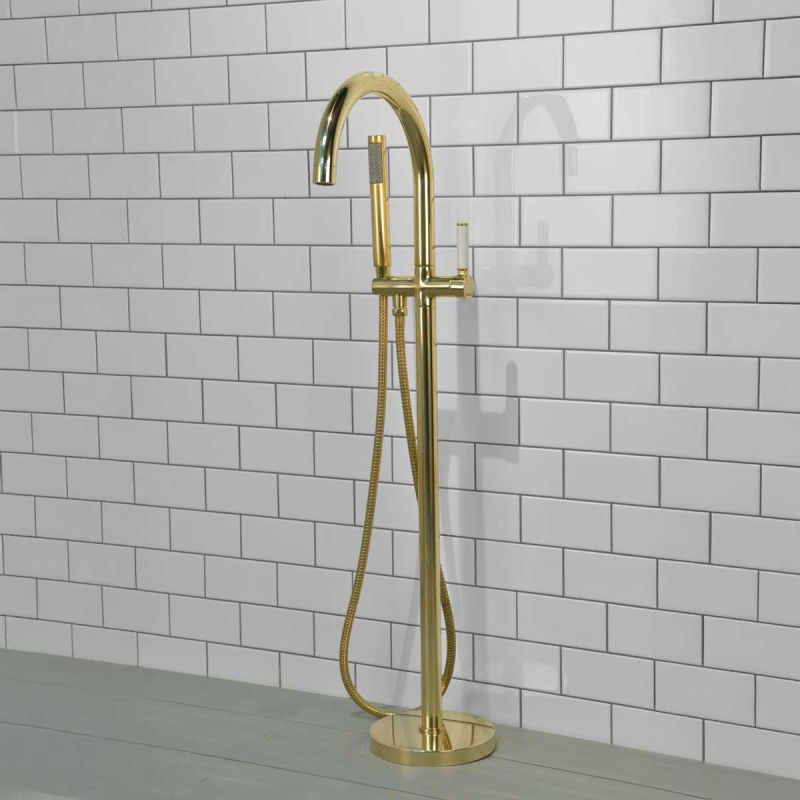 Senska - Bath Shower Mixer - Floor Mounted - White Lever - Polished Brass (Minimum pressure 2 bar)