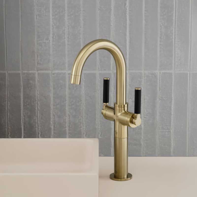 The deck mounted Senska monobloc basin mixer tap with black levers in brushed brass.