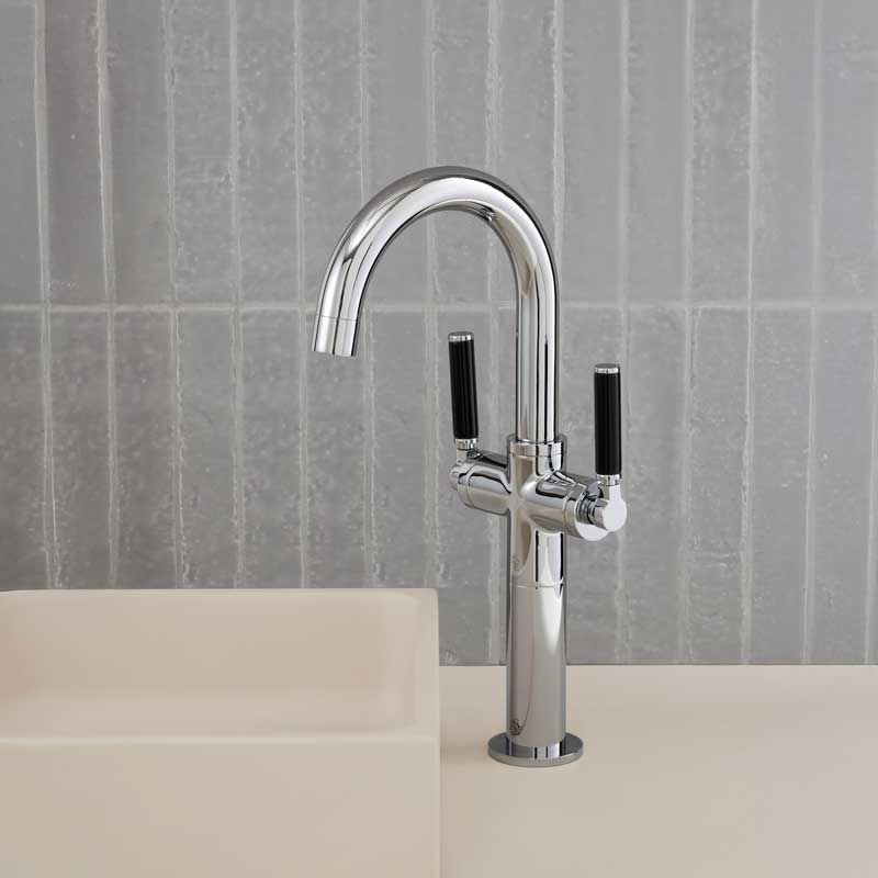 The tap shown here is without any exension pieces added and it the deck mounted Senska monobloc basin mixer tap with black levers available in a choice of Chrome Finish, Polished Nickel, Brushed Nickel, Brushed Brass and Polished Brass.
